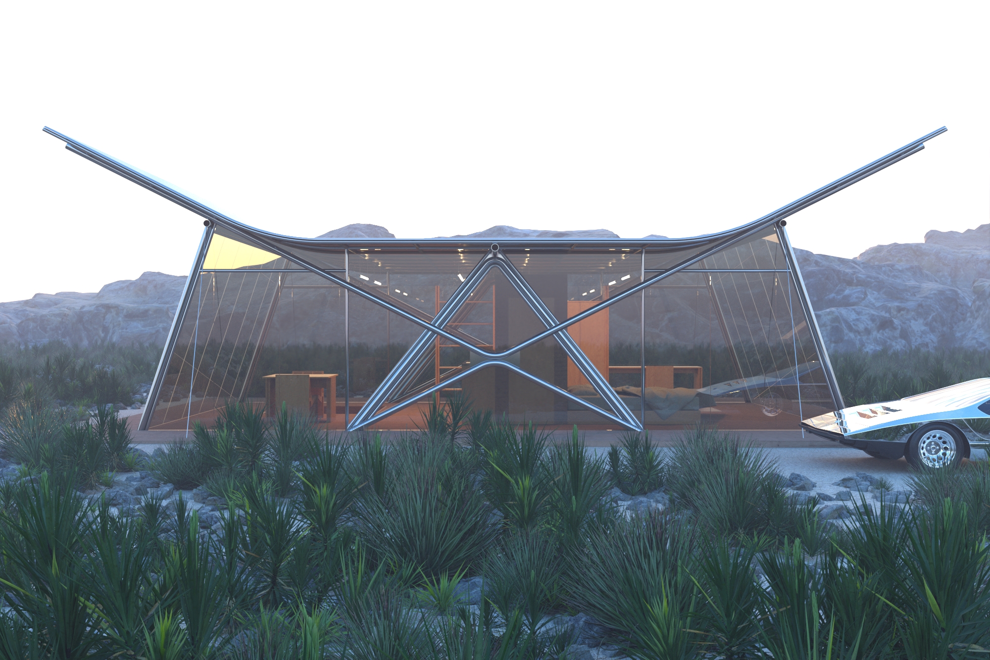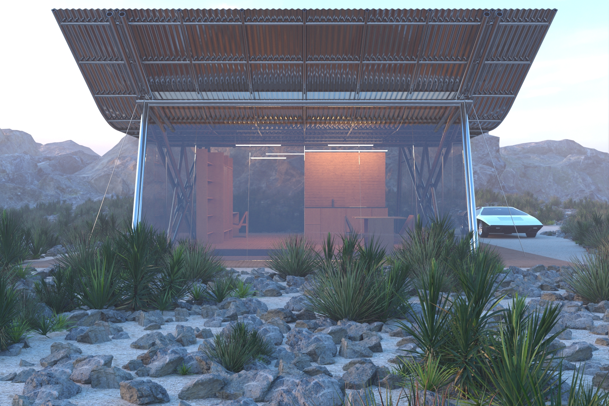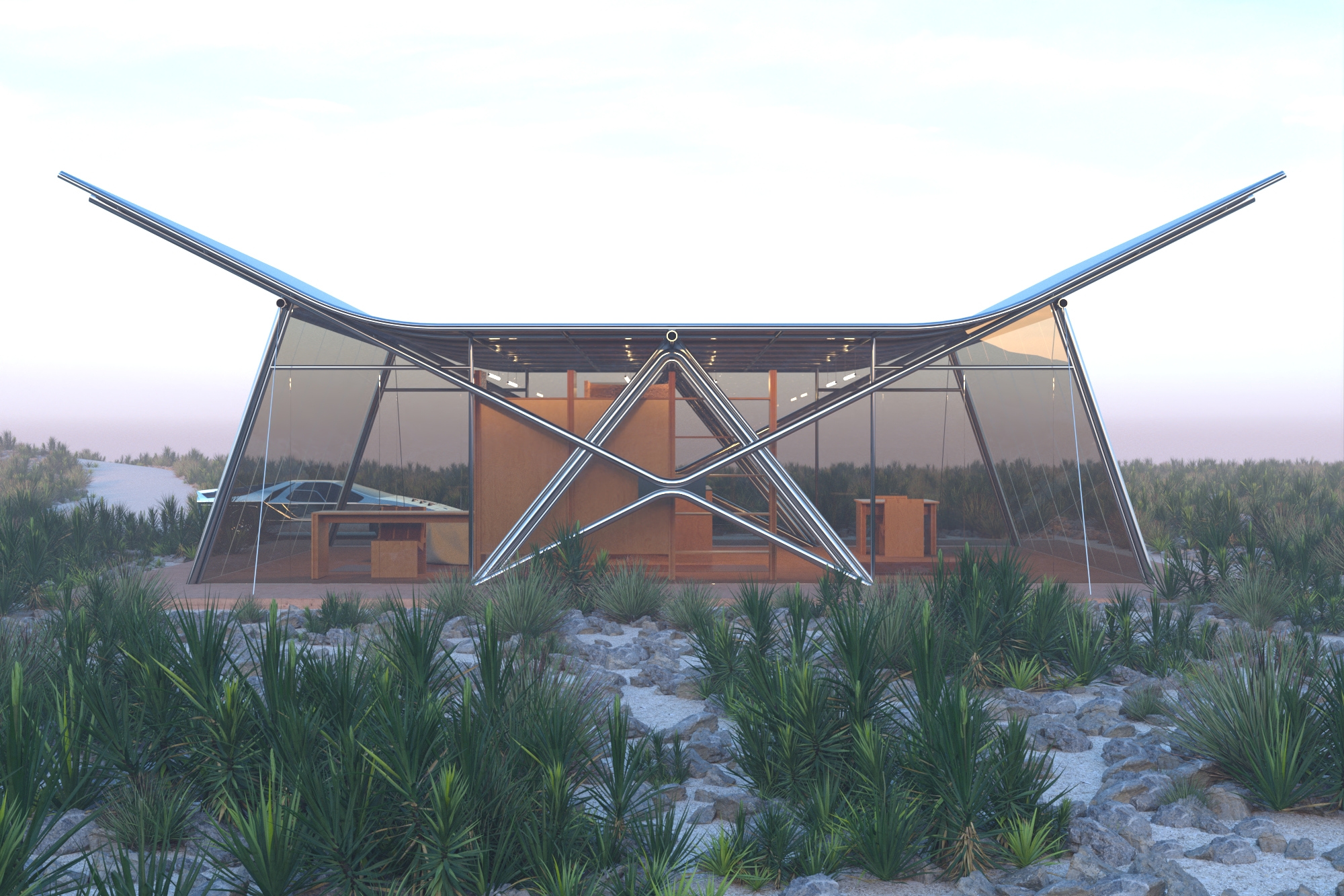 Le projet de recherche Désert lybique est une maison de 60 m² posée au bord du vide, au seuil d’un paysage désertique. Son nom fait référence au livre de Théodore Monod, figure du désert, dont l’approche lente, attentive, patiente du territoire inspire ici une manière d’habiter : en respect, en légèreté, sans s’imposer.