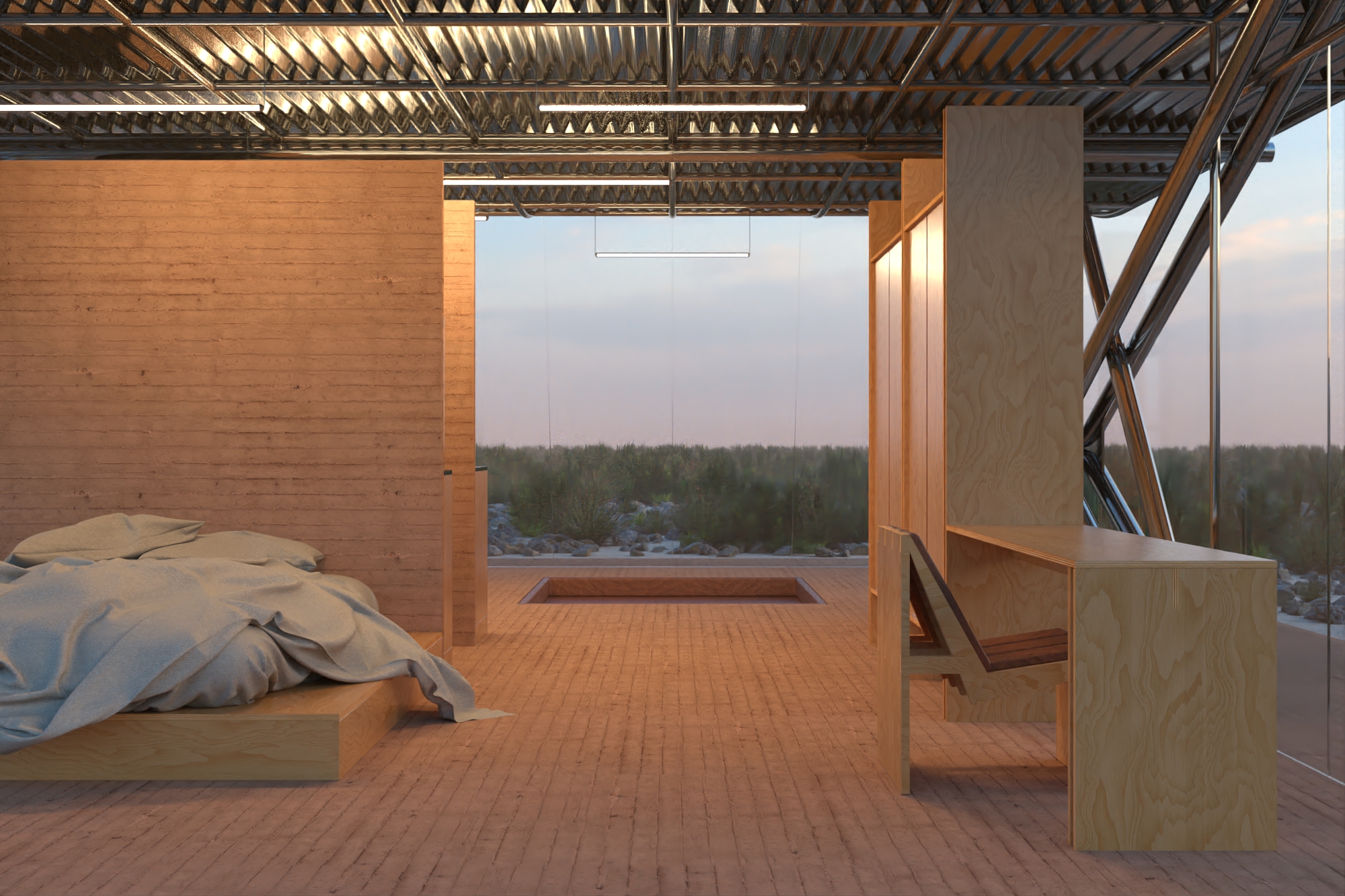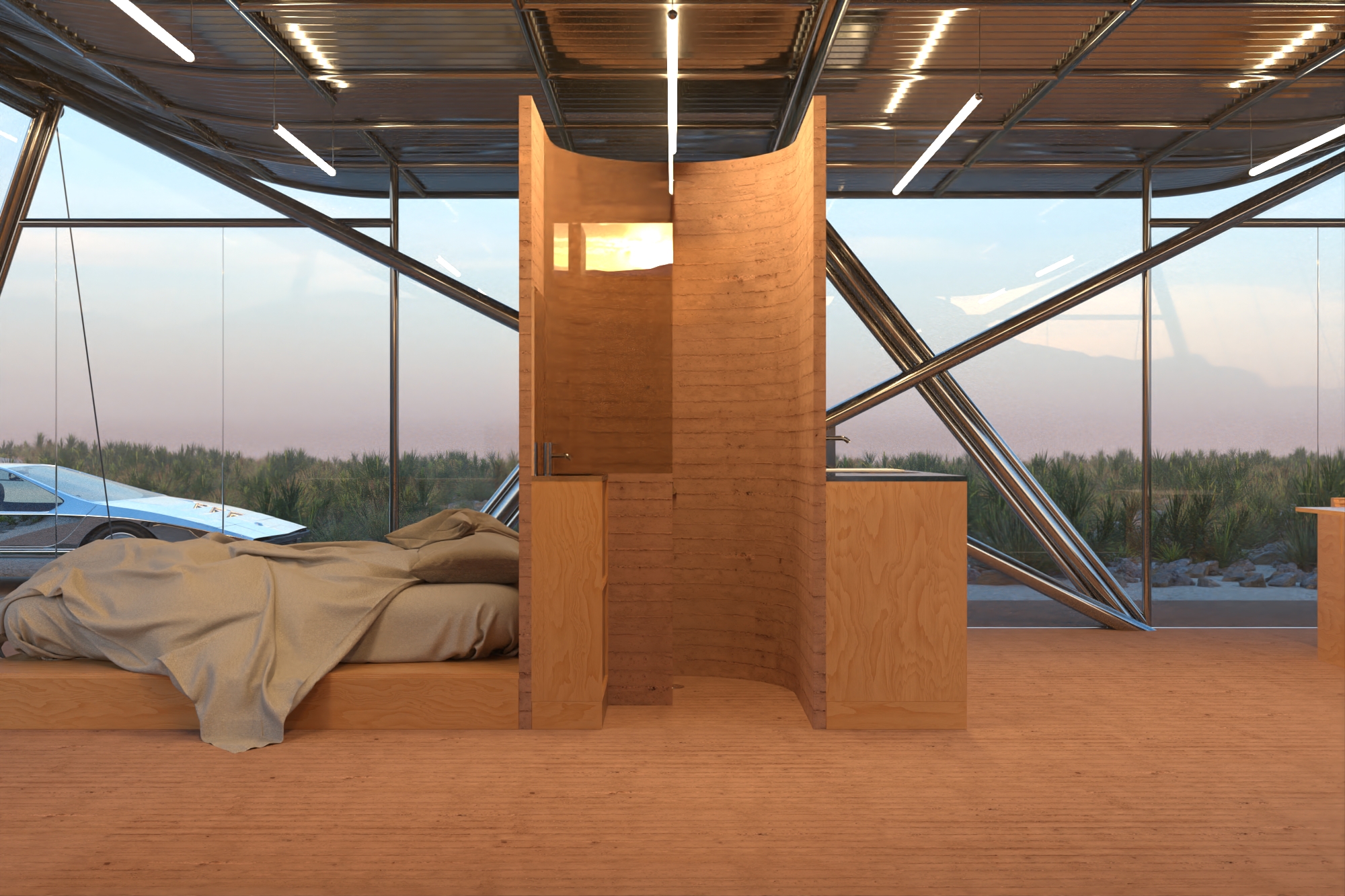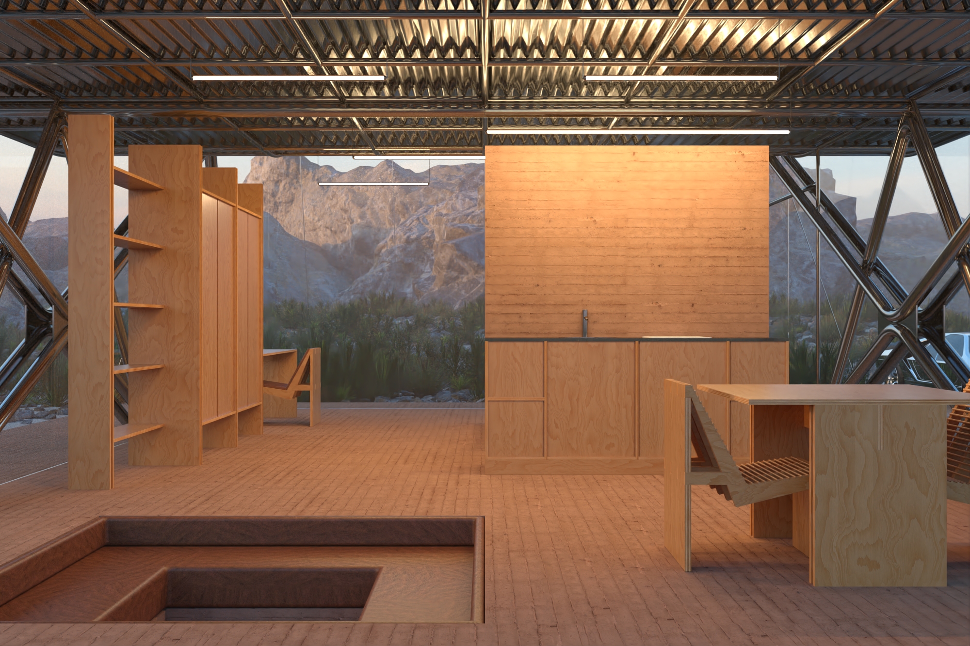 Dessinée en 2022, cette maison explore une architecture minimale, climatique et démontable, entre tradition constructive locale et rationalité moderne. Le socle, en terre compactée, est réalisé à partir de la matière du site. Il agit comme une fondation thermique naturelle, régulant les variations de température tout en ancrant le projet dans son contexte. Ce geste fondamental évoque les architectures vernaculaires du désert, pensées pour durer sans s’exhiber.